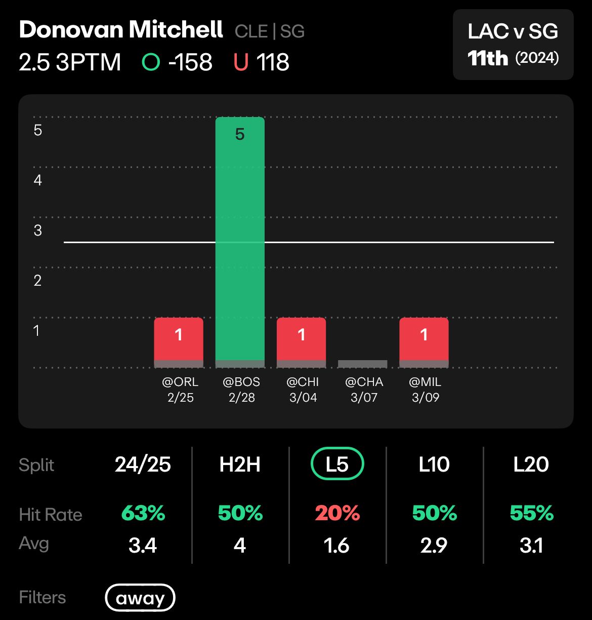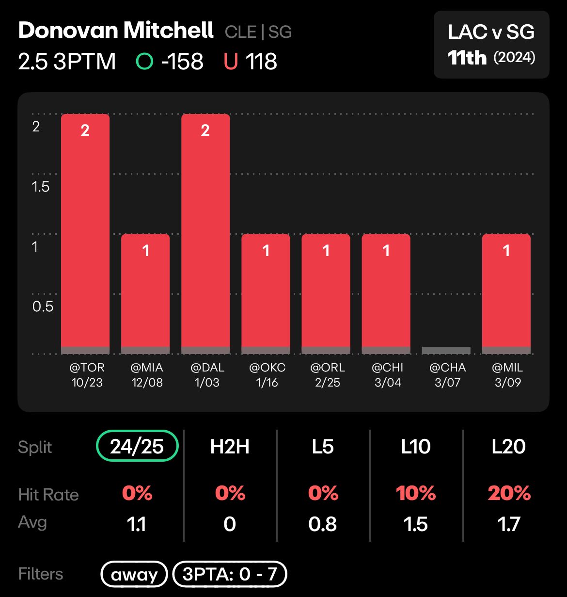 Mitchell has 1 or fewer made threes in 4 of his last 5 road games, and is averaging 7 three attempts per game in those 5 games, and that is where the problem is. He’s attempting 9.1 on average this season, and the difference in his success with more or less attempts is staggering. When Mitchell has 7 or less attempts on the road, he’s gone under this line in every game, averaging just 1.1 made three.