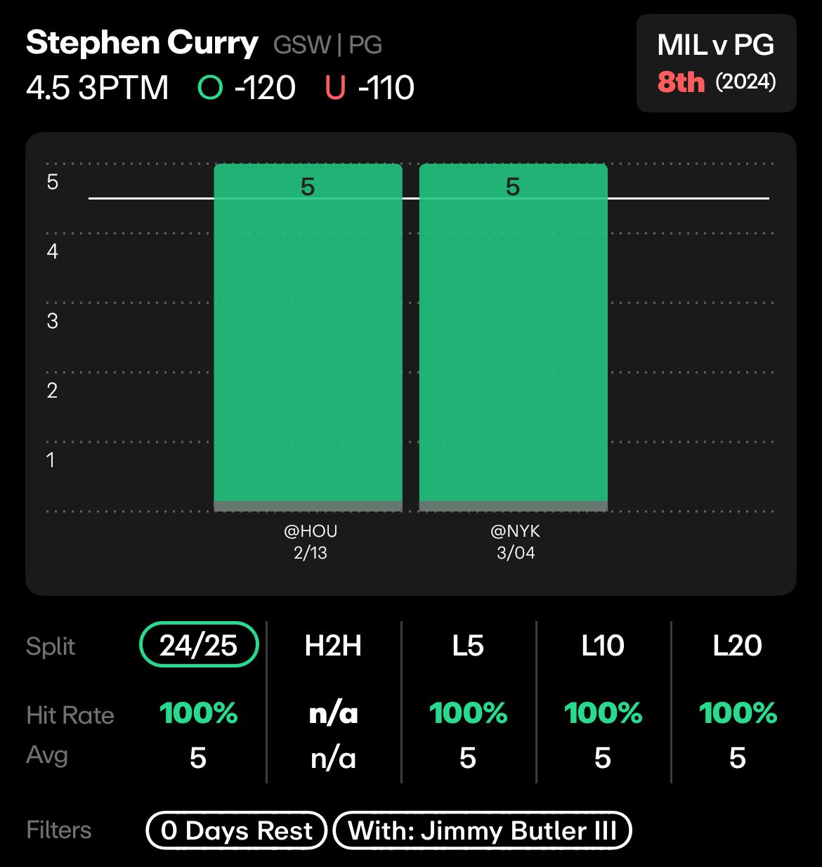 Steph Curry is so, so good in back-to-backs. He’s averaging 4.8 threes per game, has gone over this line in four straight back-to-backs (and 4 of 5 back-to-backs this season), and has gone over this 4.5 line in both back-to-backs since Jimmy Butler joined the Warriors.