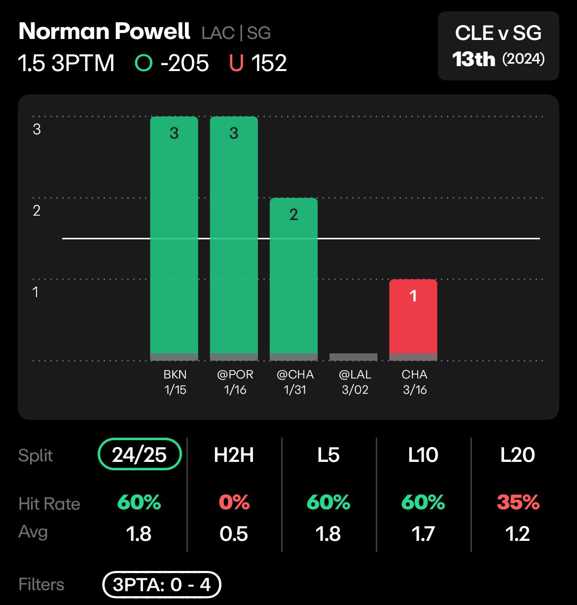We’re focusing this newsletter on 3-pointers today and on three players in different circumstances. Norman Powell is playing in his second game since returning from injury, Steph Curry is playing in a back-to-back with other strong factors, and Donovan Mitchell is looking to break out of his longest road game drought of the season.