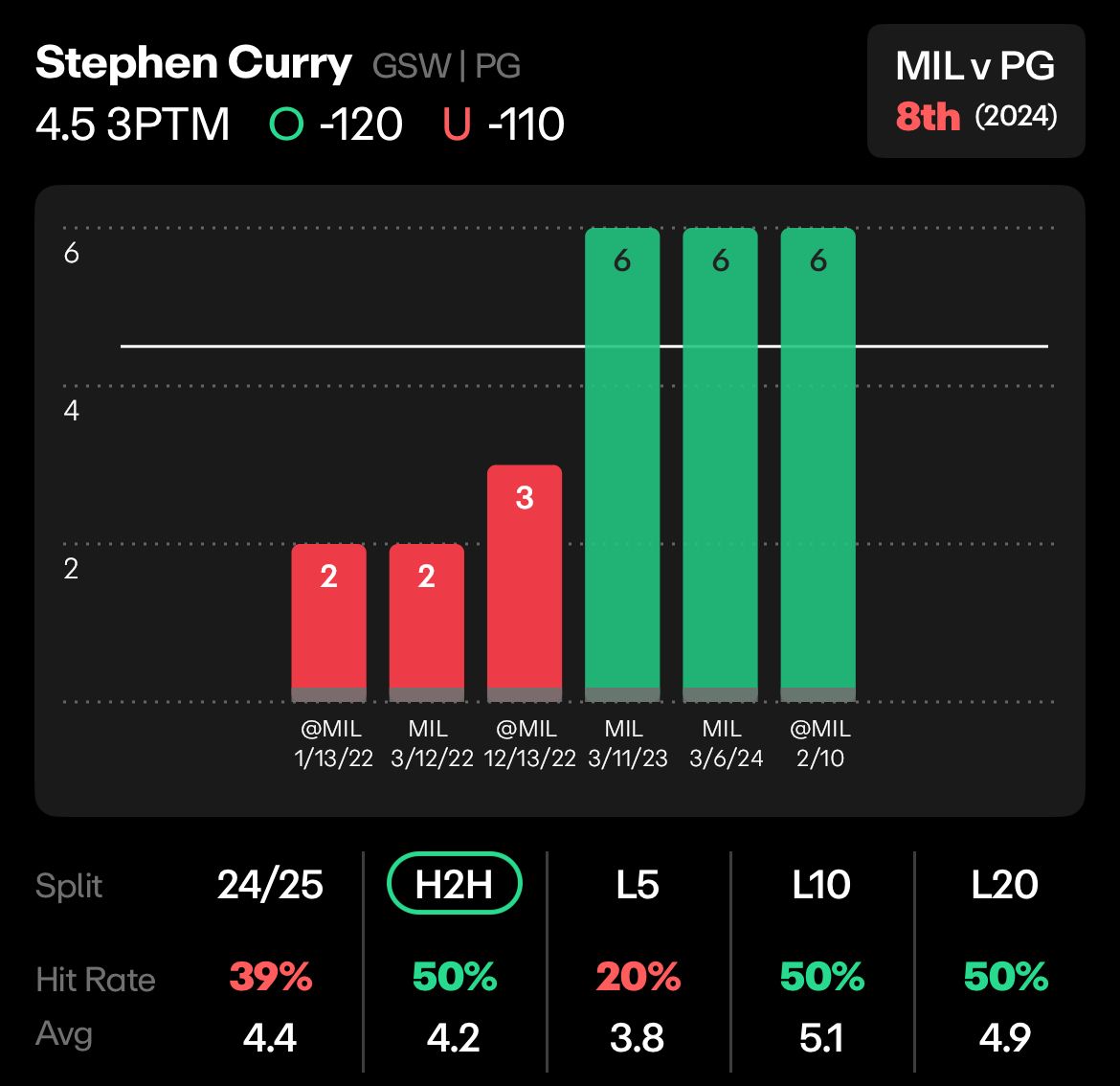And Curry has outstanding head-to-head data against Milwaukee, racking up three straight games with six three’s against the Bucks.