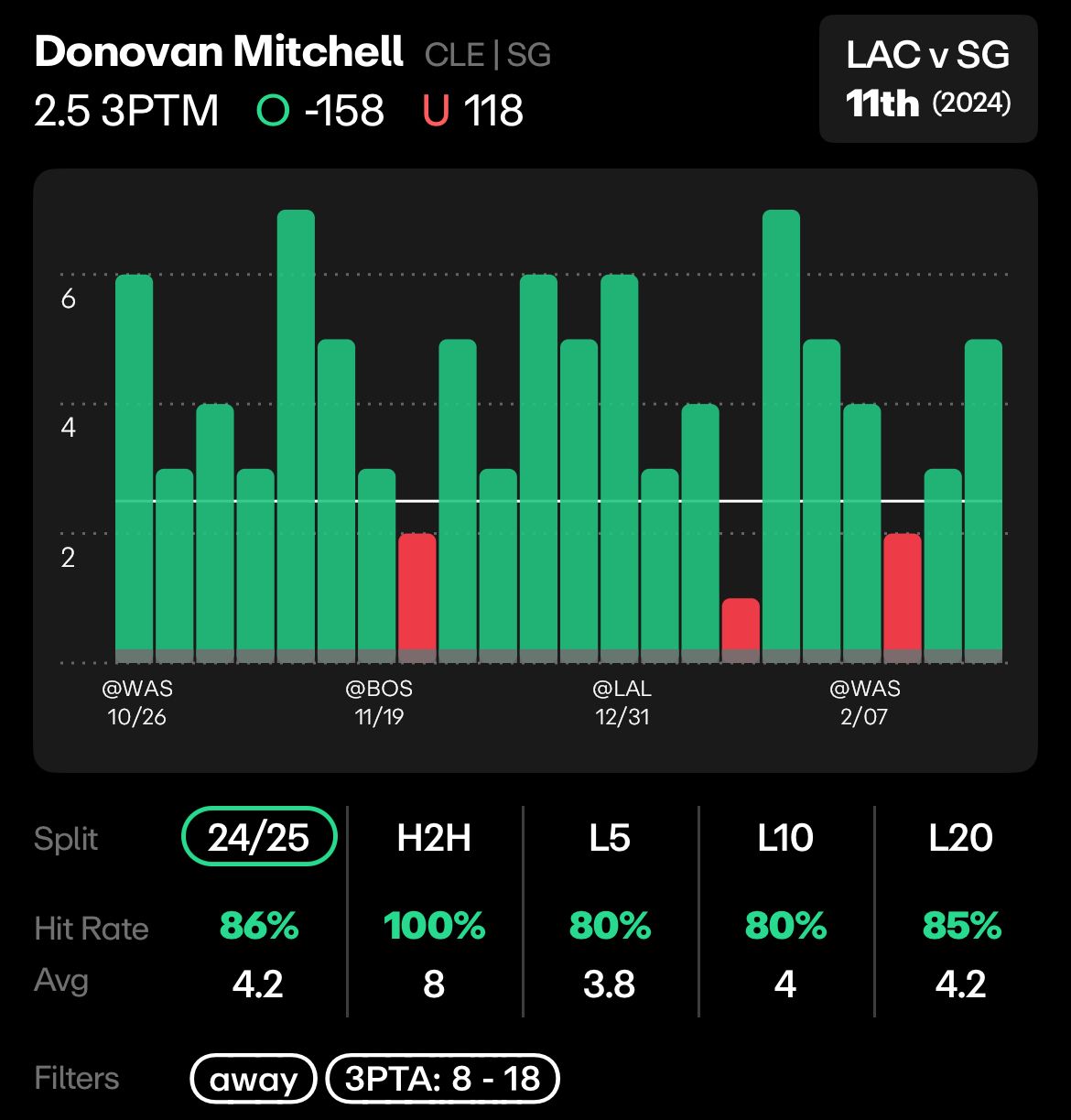 Mitchell with 8 or more attempts on the road averages 4.3 made threes, going over this 2.5 line in 86% of those games.