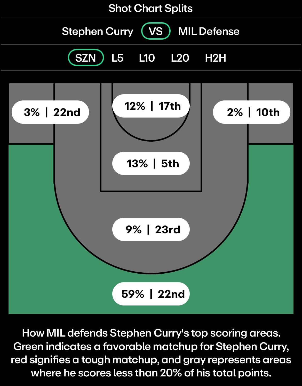 Curry’s shot chart, with the Bucks 3 point defense rank (22nd)