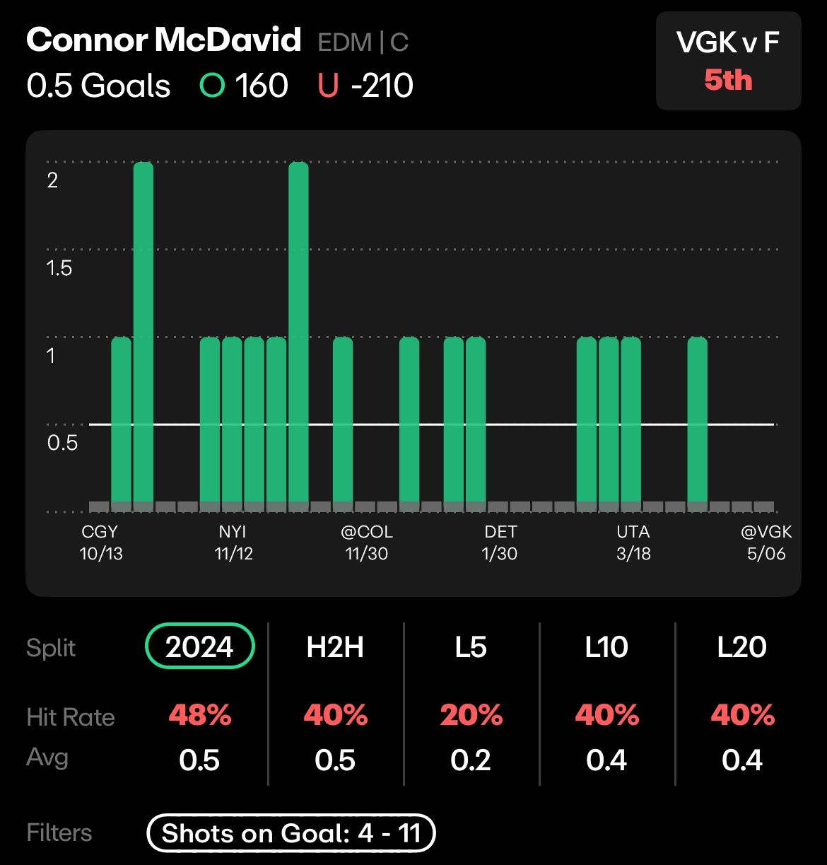 McDavid doesn’t have a goal in 4 straight games, and in game one he had 4 shots on goal and 9 shot attempts. He scored in 15 of 31 games this season with 4 or more shots on goal, a 48% hit rate. That hit rate wouldn’t be something worth highlighting usually, but in the anytime goal market, 48% is pretty good.