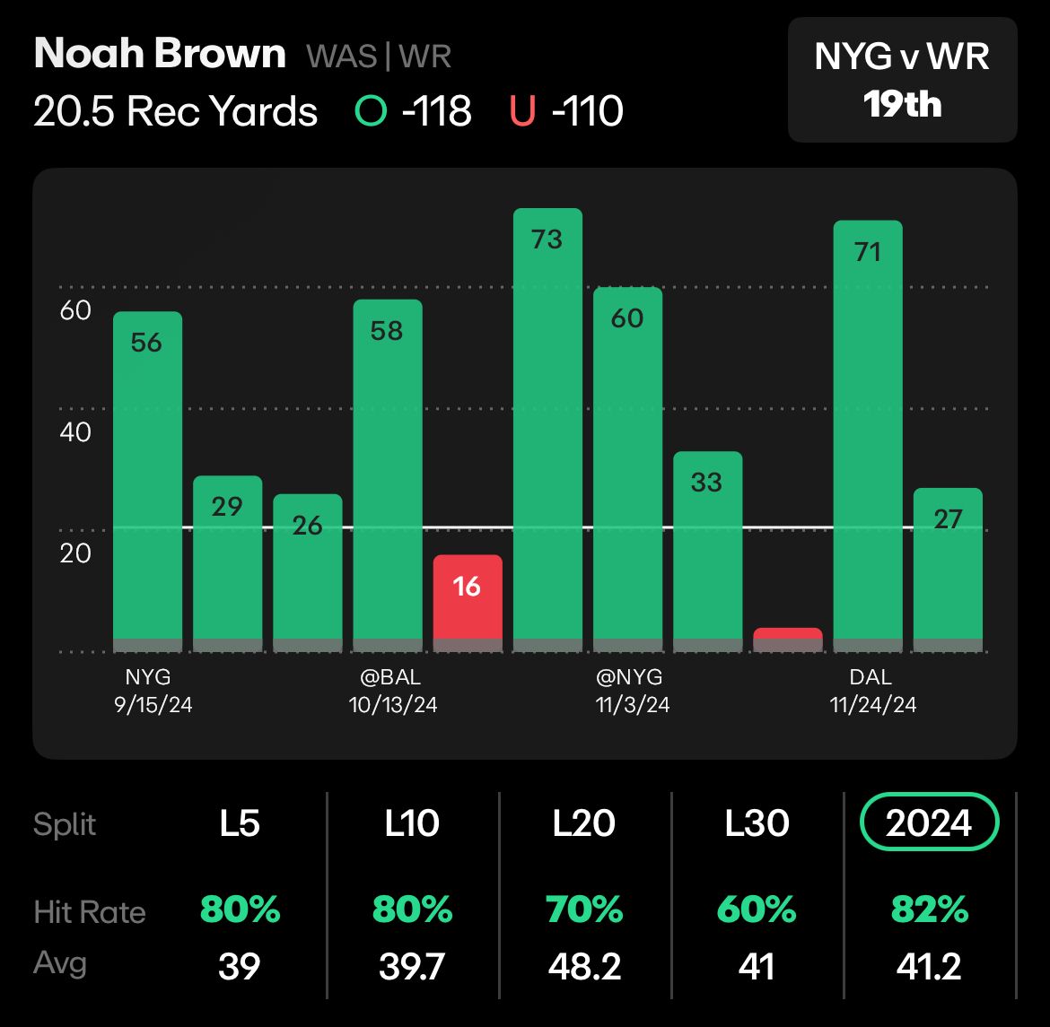 He averaged 41.2 yards per game last season, went over this 20.5 line 82% of the time, and an even better 46.0 yards at home, with an 83% hit rate.