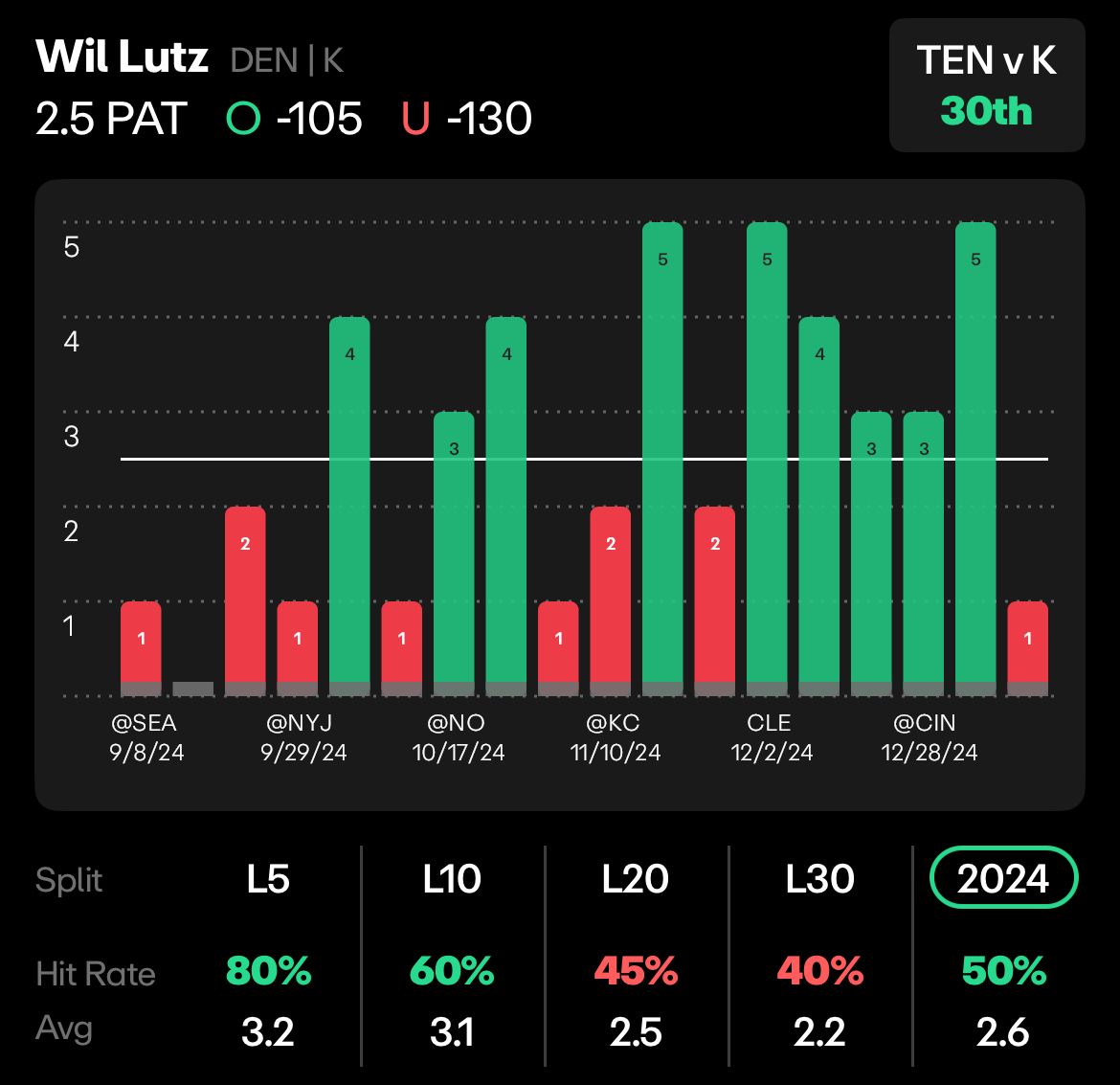 Lutz averaged 3.5 PATs last season at home, clearing this line in 75% of his home games.