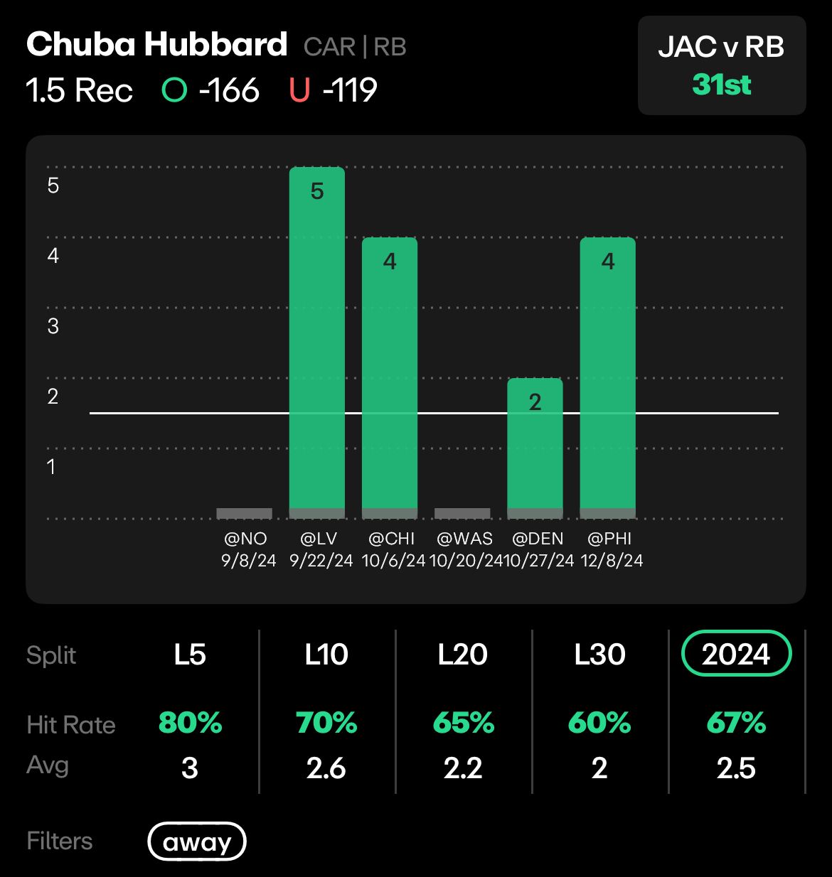 CAR vs JAC - Chuba Hubbard, 1.5 Receptions