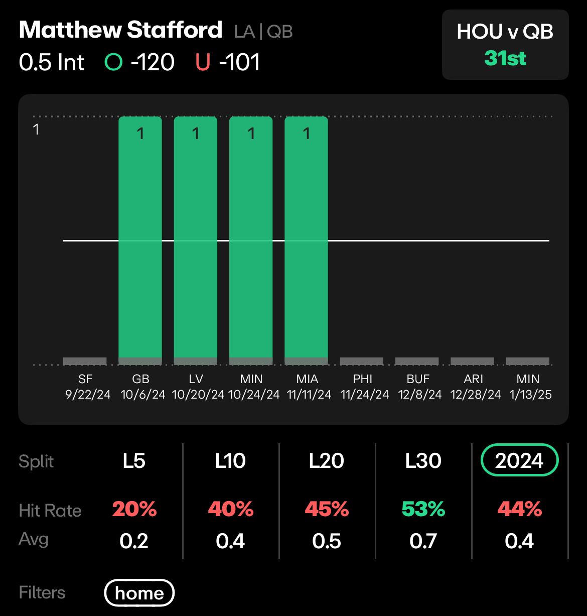 HOU vs LA - Matthew Stafford, 0.5 Interceptions