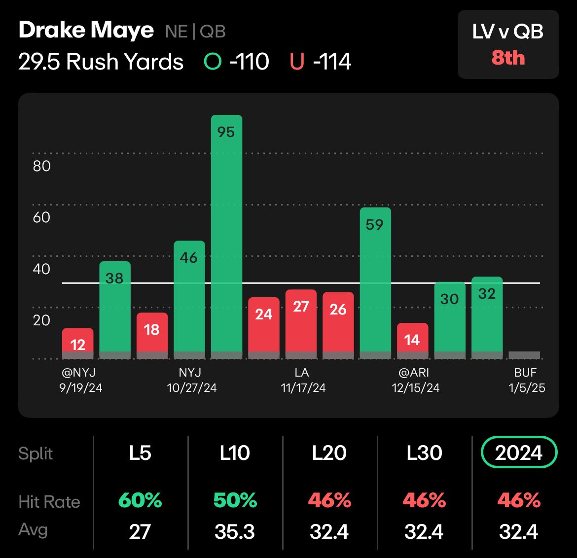 Fun fact: Drake Maye would’ve finished third in rushing yards amongst quarterbacks across a 17-game pace. He only played 11 games, and still finished 9th amongst quarterbacks. When it comes to this 29.5 rushing line, Maye has some solid data.