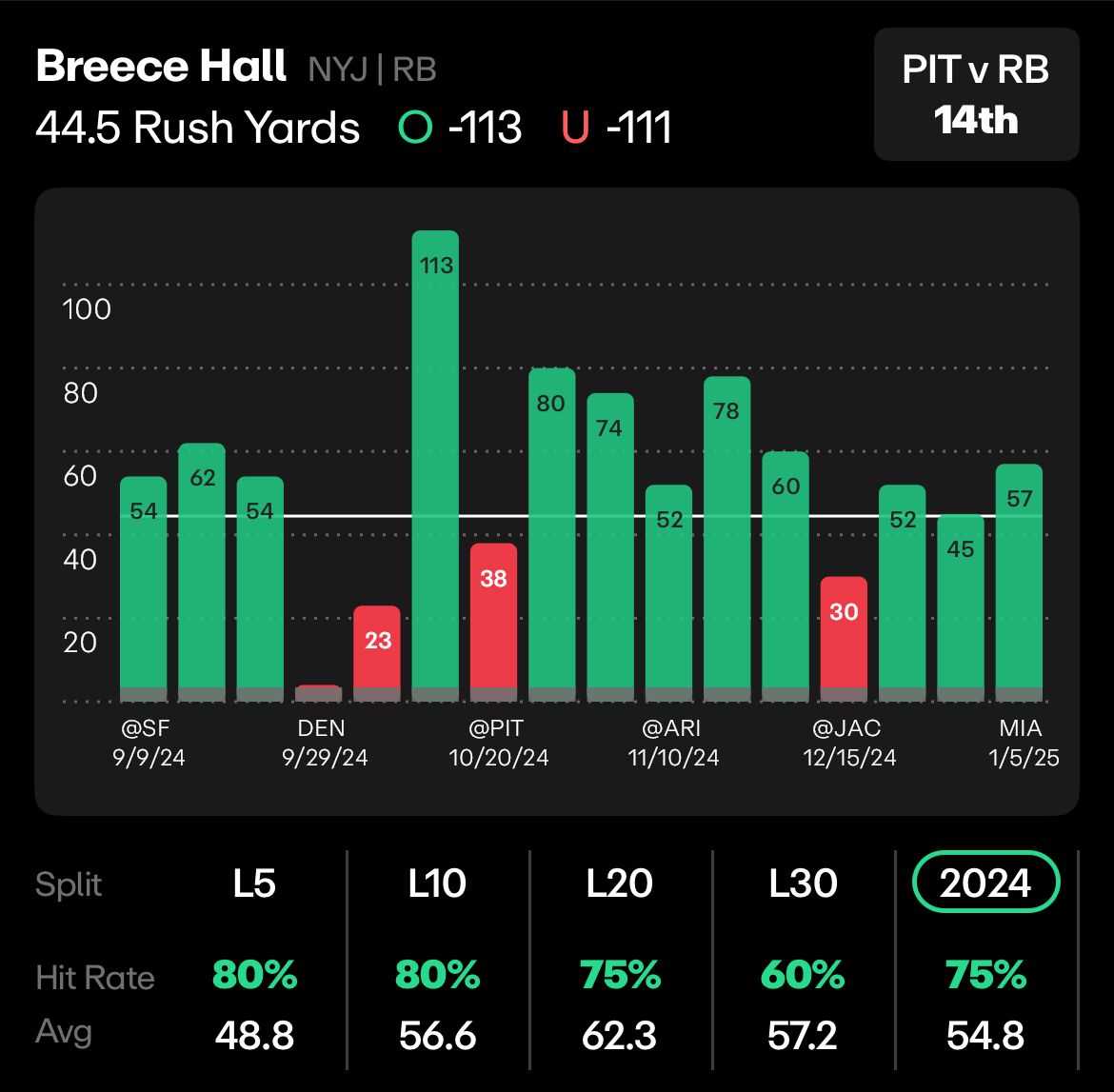 Aaron Rodgers and Robert Salah/Jeff Ulbrich are gone, Justin Fields and Aaron Glenn have arrived. With the men at the helm, how Hall and Braelon Allen will be deployed is in question. Regardless, 44.5 yards is a low line for a running back that averaged 54.8 yards per game and went over this line in 75% of his games last season.