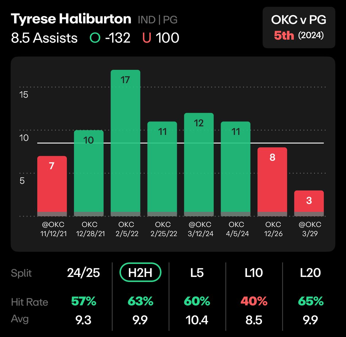 Haliburton’s playoff average of 9.8 assists per game makes this line look tempting — but his track record vs OKC tells a different story.