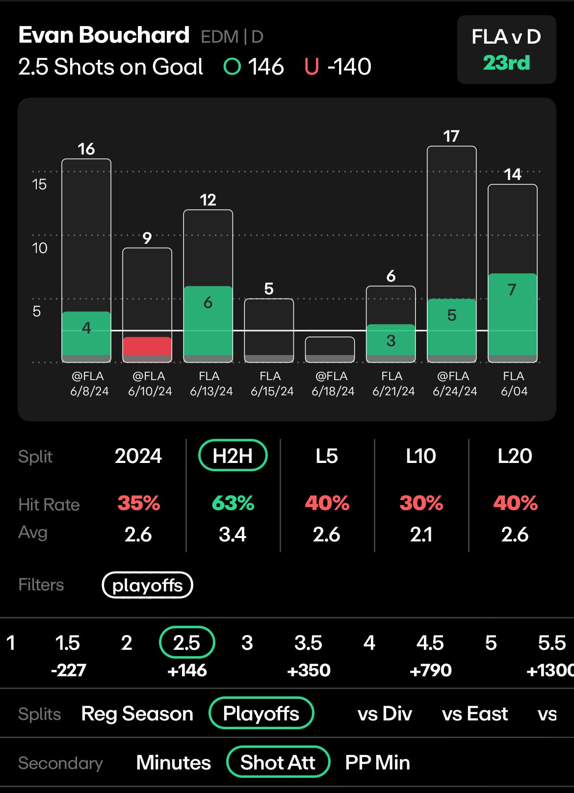 And it gets better: last season in the playoffs, Bouchard averaged 2.9 shots on goal, going over this number in 4 of 7 games and 2 of 3 home games versus Florida.