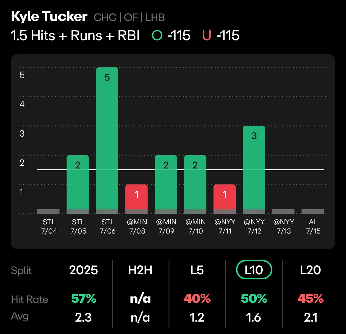 In his final 10 games before the break, Tucker had 2+ HRR five times, 3+ HRR twice, and had a hit in 7 of the 10.