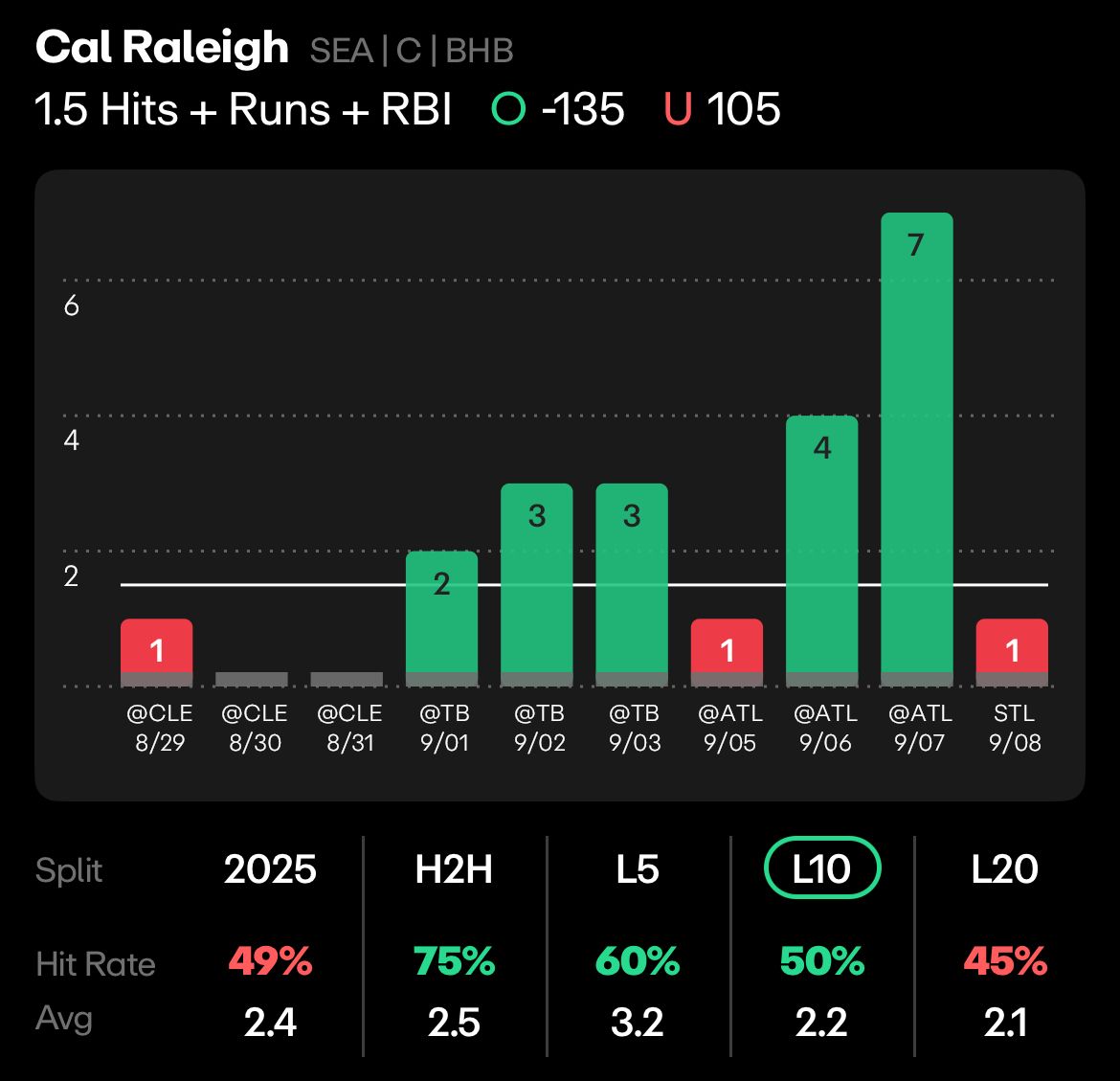 Player: Cal Raleigh - Projection: 3.4 Hits+Runs+RBIs