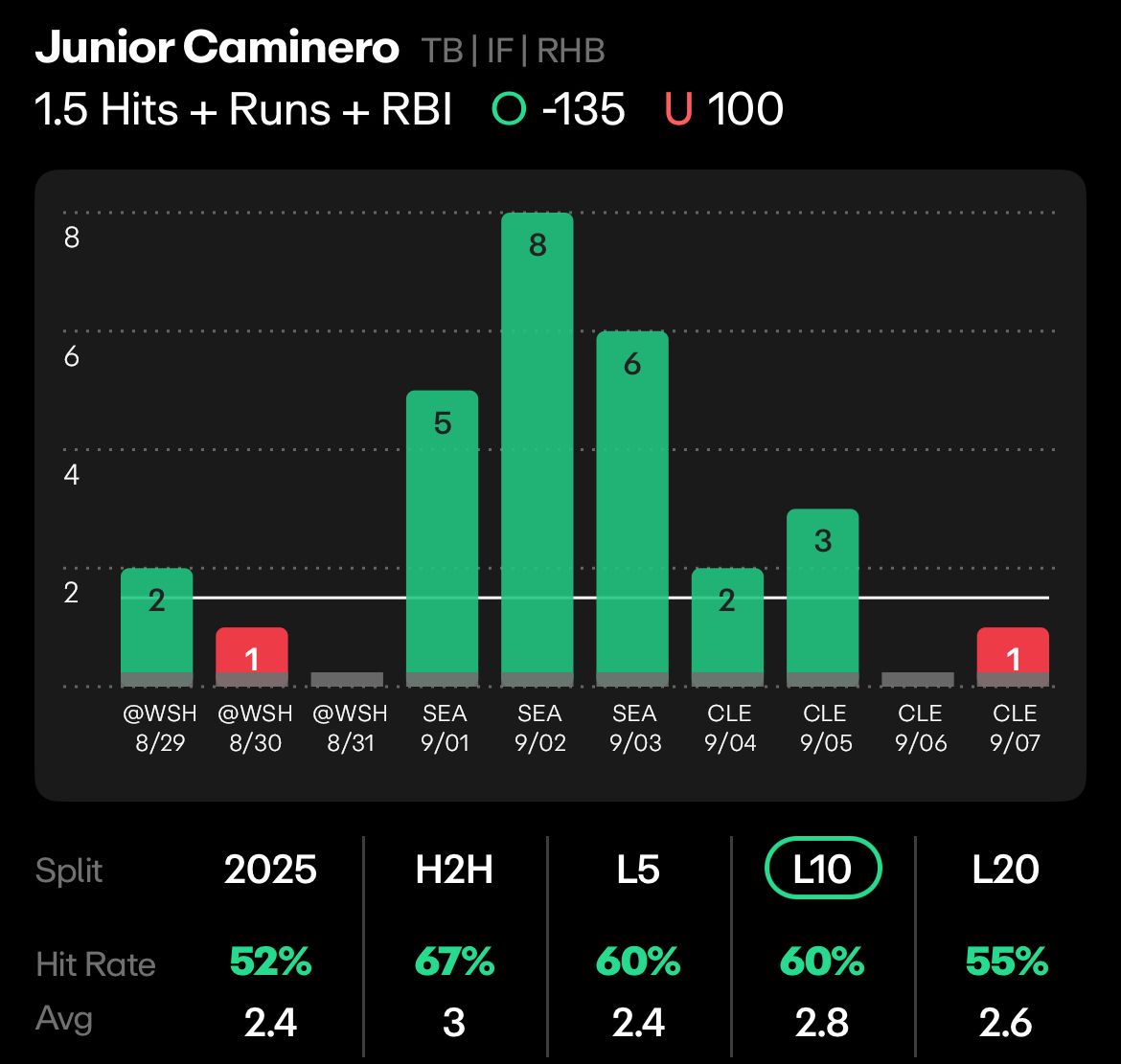 And although he’s been shut out in his last 2 games versus a right-handed starter, Caminero is still averaging 3.6 HRR in his last 5 against a righty starter.
