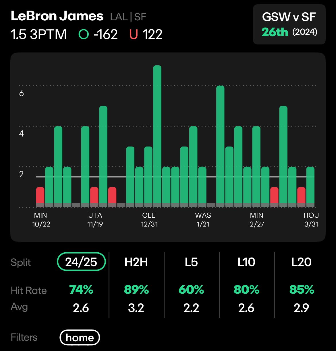 But as you can see, he’s gone over in back-to-back games, so could he be getting primes just in time to play the best shooter of all time? It also helps that he’s at home, where he averages 2.6 made threes, going over this line in 74% of his home games.