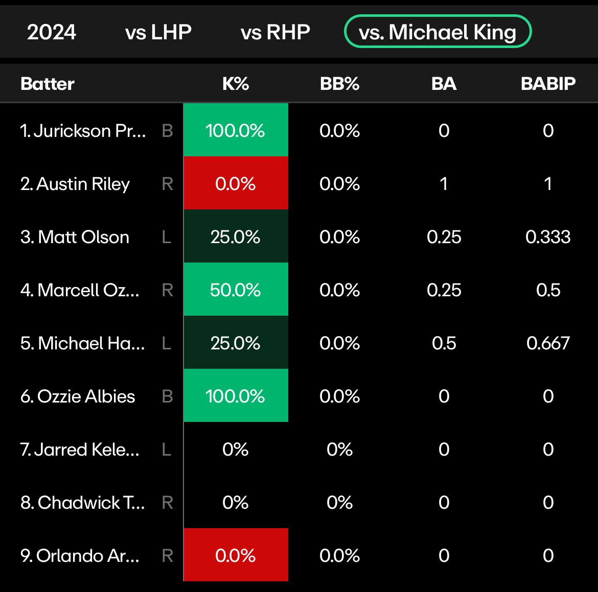 Michael King had a monster 12-strikeout game against Atlanta in October, and although the Braves’ lineup is different 6 months later, 5 of the players in Atlanta’s lineup have a K rate above 25% against King, with three of those 50% or higher.
