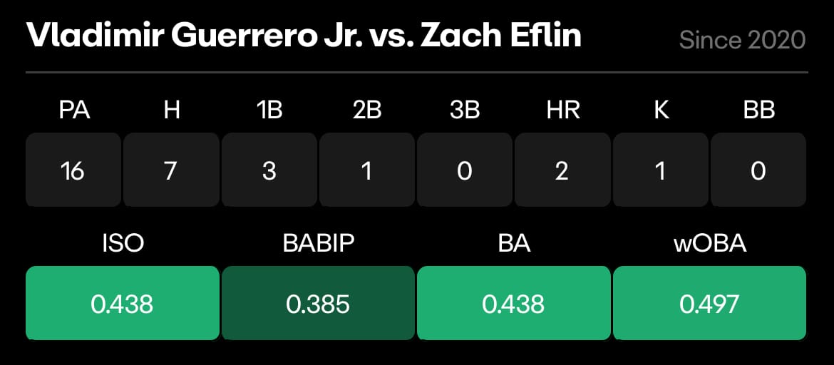 Opposing batters had a .254 batting average against Eflin last season, and opposing righties had a .281 average, so this matchup is a position of advantage for Guerrero Jr.