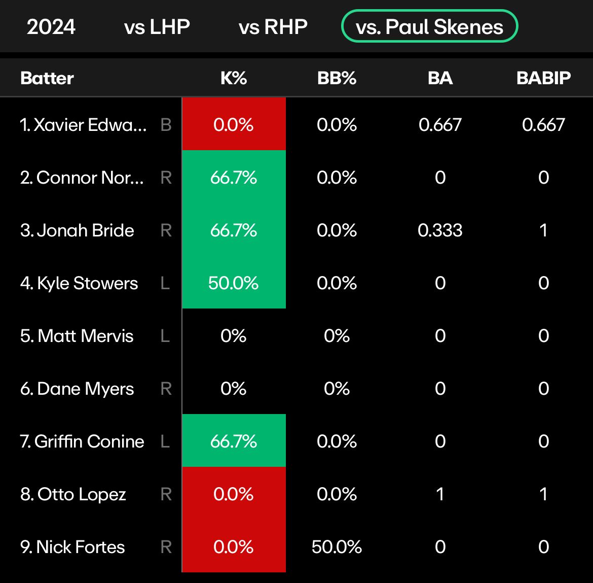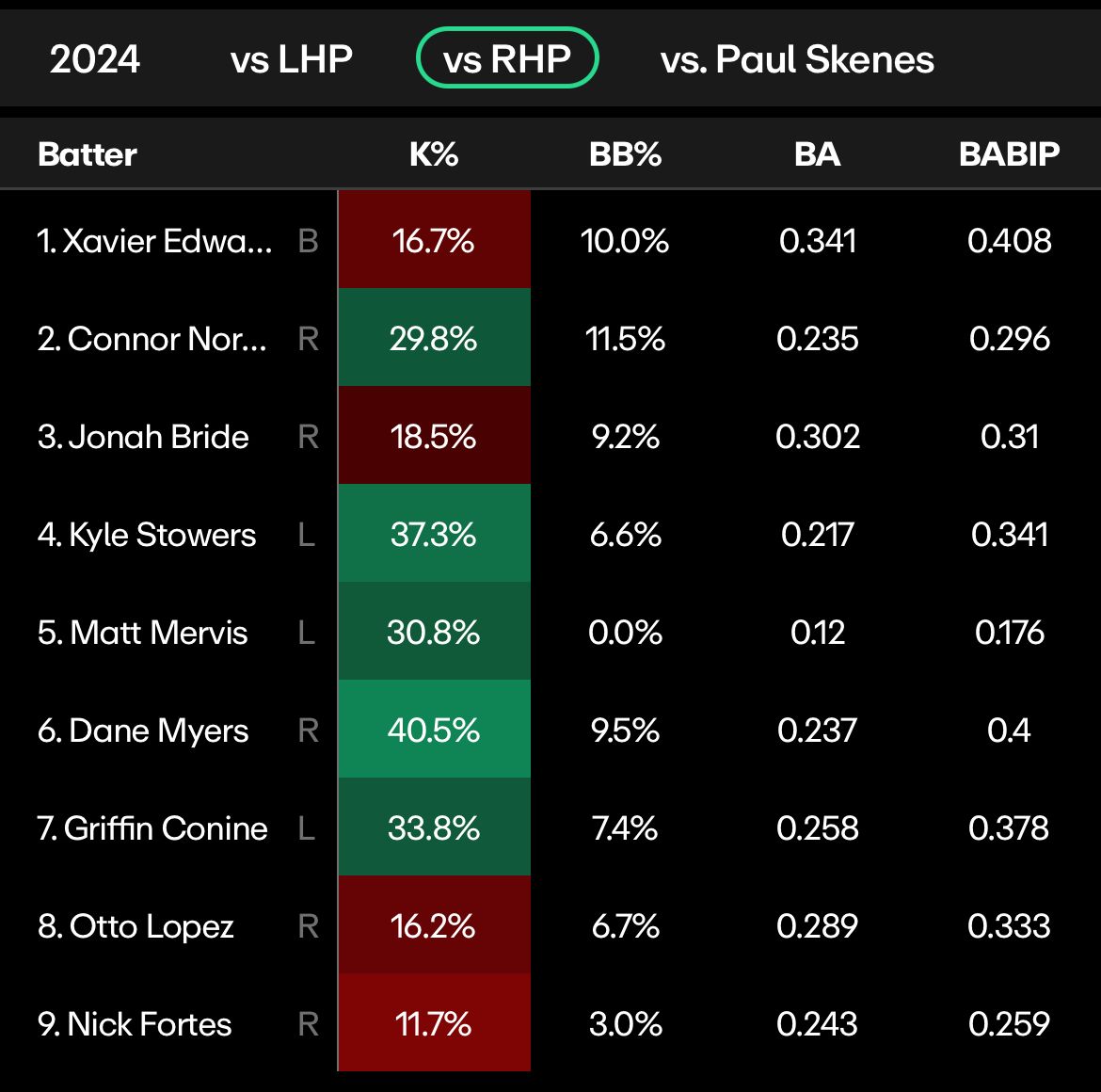 Also in that lineup is Chadwick Tromp, who struck out 31.5% of the time against right handed pitchers last season.