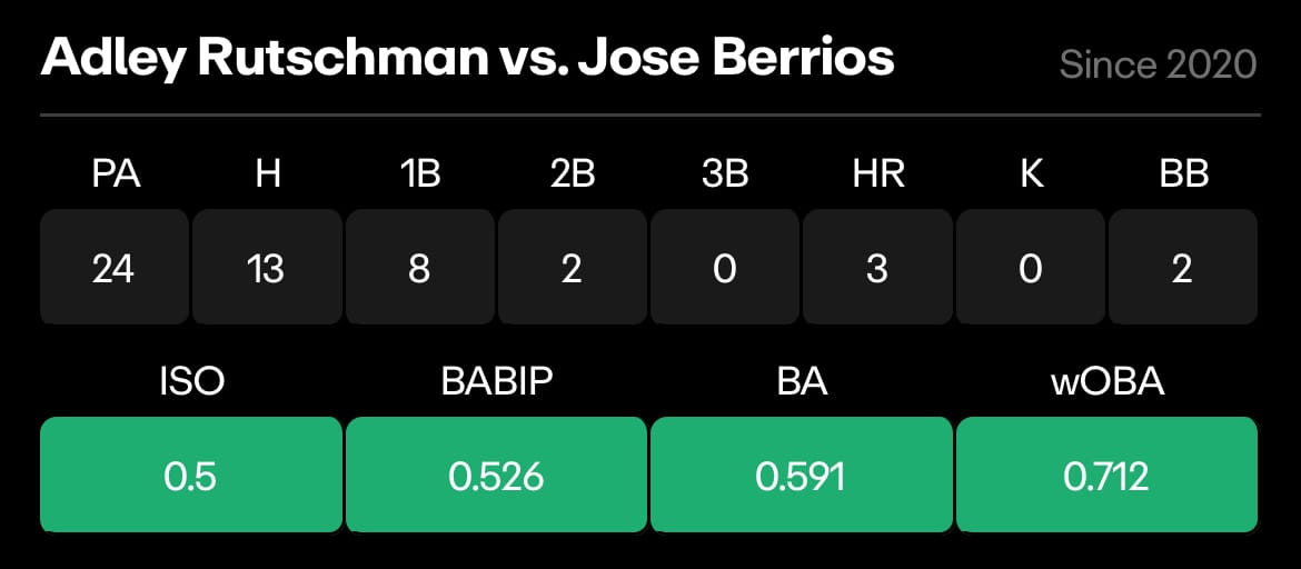 Jose Berrios gets the nod for the Blue Jays, and Adley Rutschman has to be jumping for joy. In 24 plate appearances against Berrios, he has a .591 batting average with 3 home runs and 2 doubles.