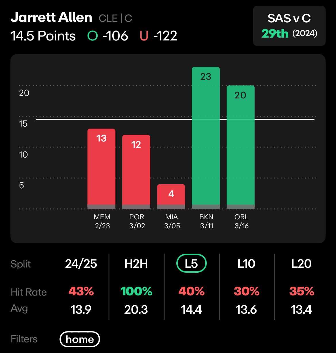 His recent play is encouraging, too. Allen, who has only averaged 13.9 points per game at home this season, has had monster back-to-back games at home, scoring 43 combined points against Brooklyn and Orlando.