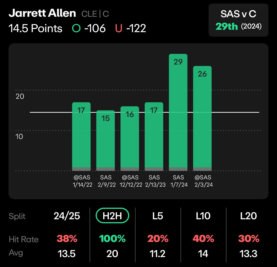 No Victor Wembayama + Allen’s history against San Antonio + the Spurs rankings against centers makes for the perfect recipe for Allen today. He has absolutely crushed the Spurs in their last 6 matchups, including the two last year where he combined for 55 points in two games.
