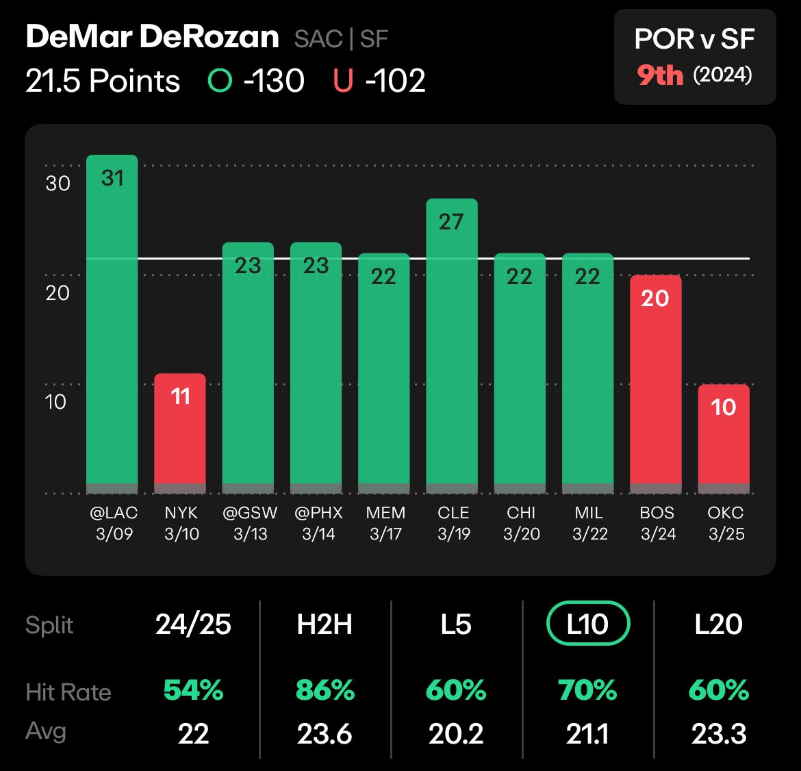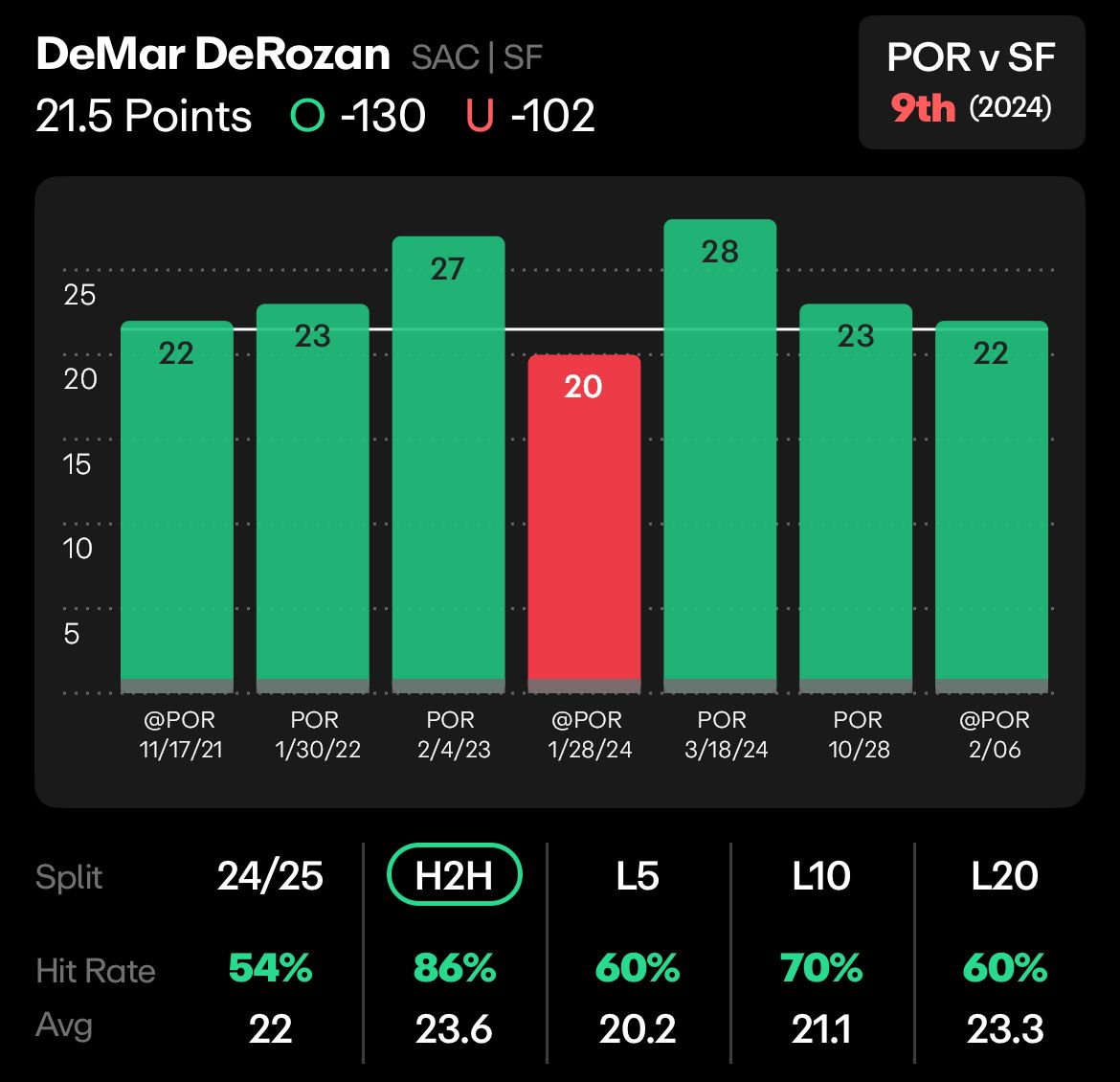 Dating back to 2021, DeMar has gone over this number in 6 of his last 7 games against the Trail Blazers, including two games this season.