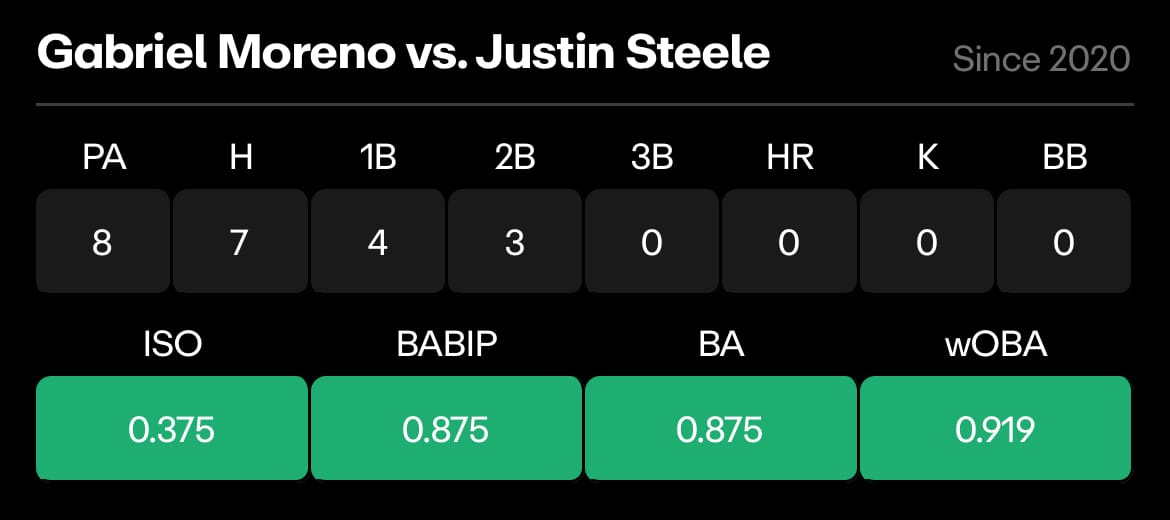 If Rutschman is jumping for joy at the idea of playing Berrios, Moreno is jumping through the stratosphere at the idea of facing Justin Steele. In 8 plate appearances against Steele, he has an .875 batting average and has a hit in 7 straight plate appearances against Steele.