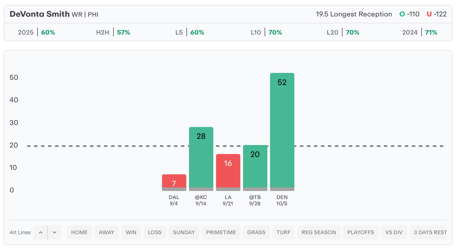 DeVonta Smith o19.5 Longest Reception