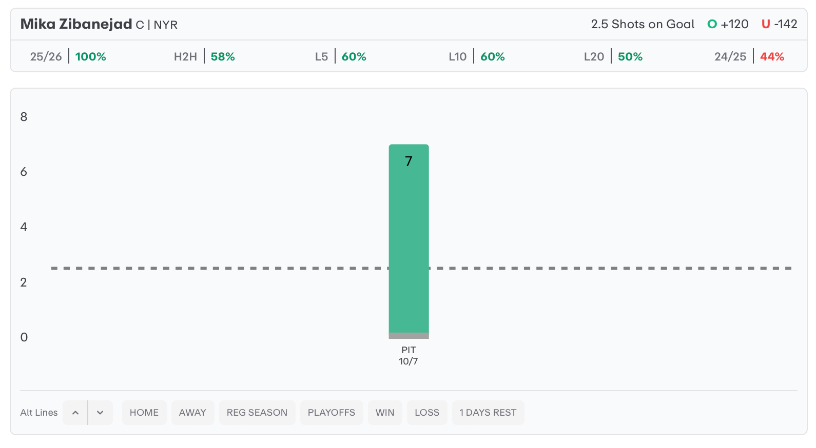 In his season opener against Pittsburgh, Mika Zibanejad landed 7 shots on goal on 11 total attempts. With this type of volume, we will look at him again tonight against Buffalo. He hit this line in all 3 meetings with the Sabres last season, and he had a 70% hit rate over this line in games with 5+ attempts.
