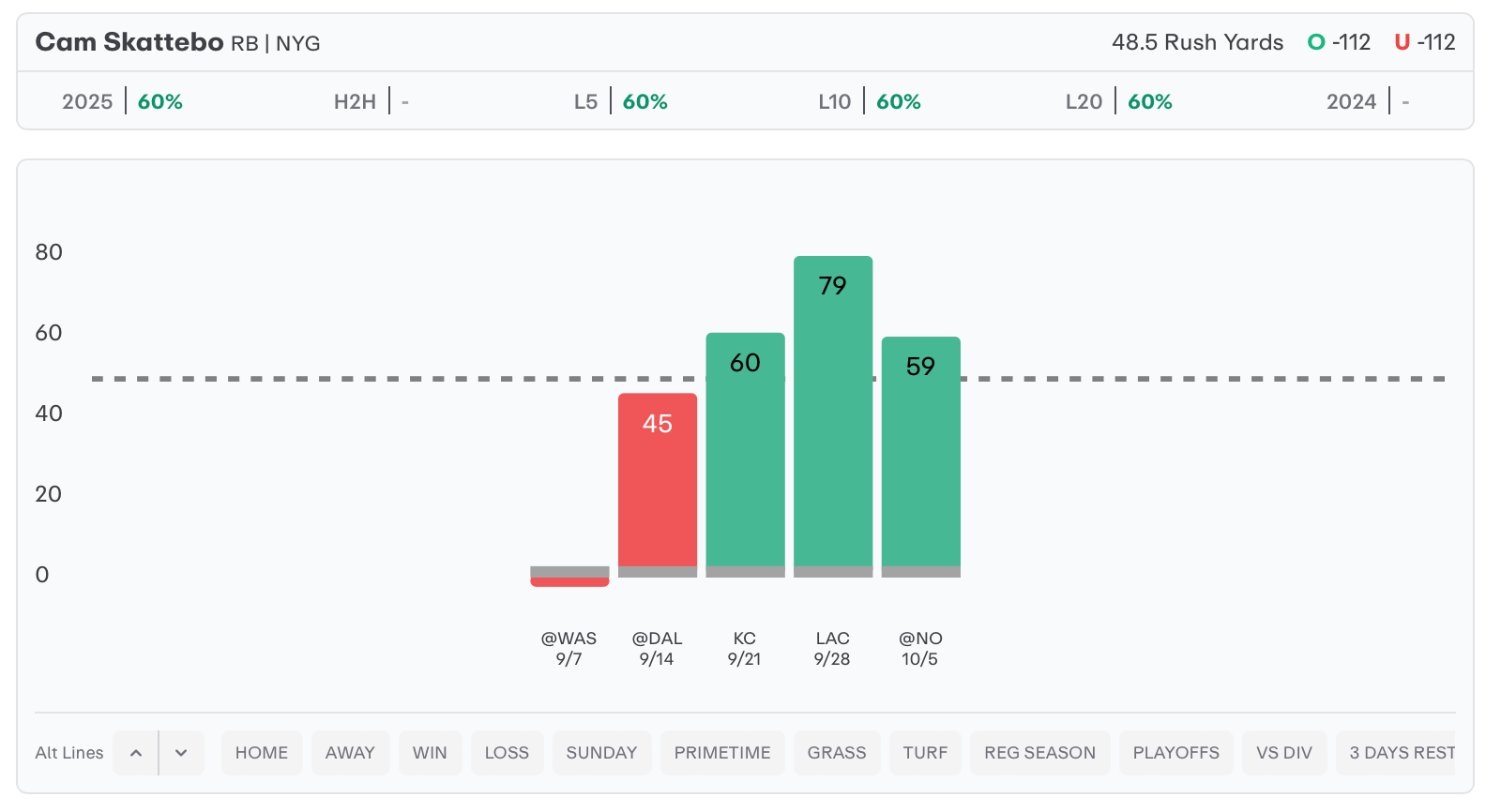 Cam Skattebo has rushed for 59+ yards in three consecutive weeks, and the Philadelphia Eagles come into this one ranked 22nd against rush yards. They have allowed multiple RBs to put up some nice games against them this season, could Skattebo be the next one up?
