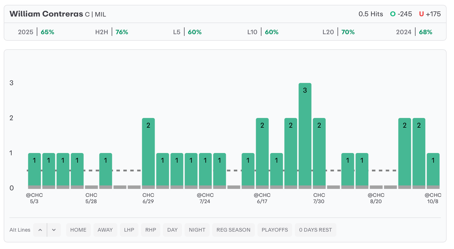 William Contreras has a hit in 76% of his games against the cubs, including 5 in this series. We like him again tonight with Matthew Boyd pitching for Chicago. In 10 PA against Boyd, Contreras has 3 singles, 1 double, and 1 home run.