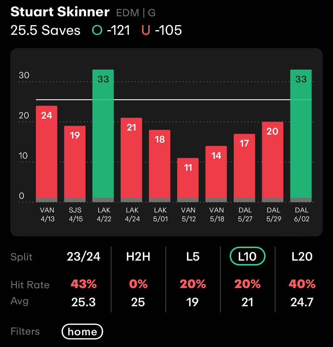 Skinner has been under this number in both games of this series, and with Edmonton needing a win, I imagine Skinner won’t have a busy night, and this under could keep riding. He’s also been under in 8 of his last 10 home games.