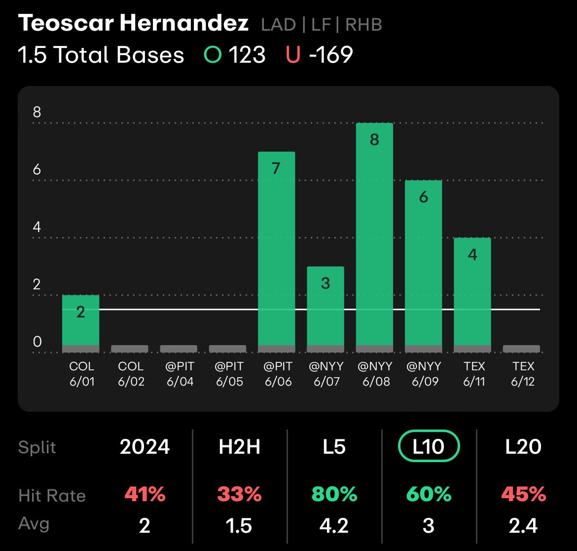 Hernandez has been on fire, with 28 total bases over his last 7 games.