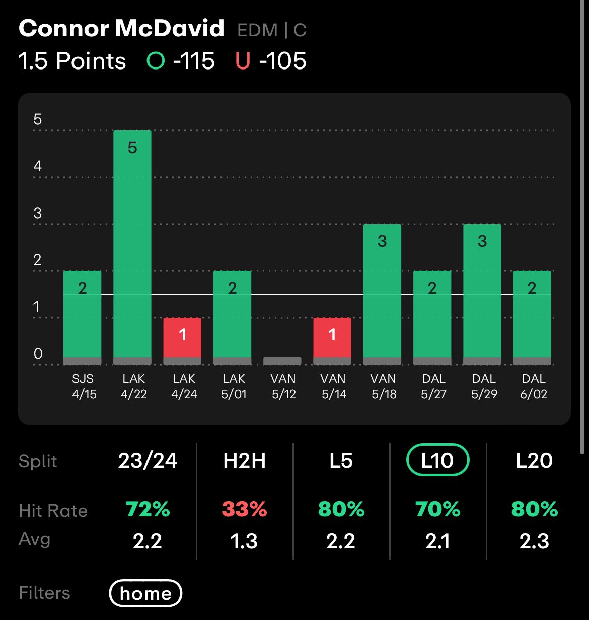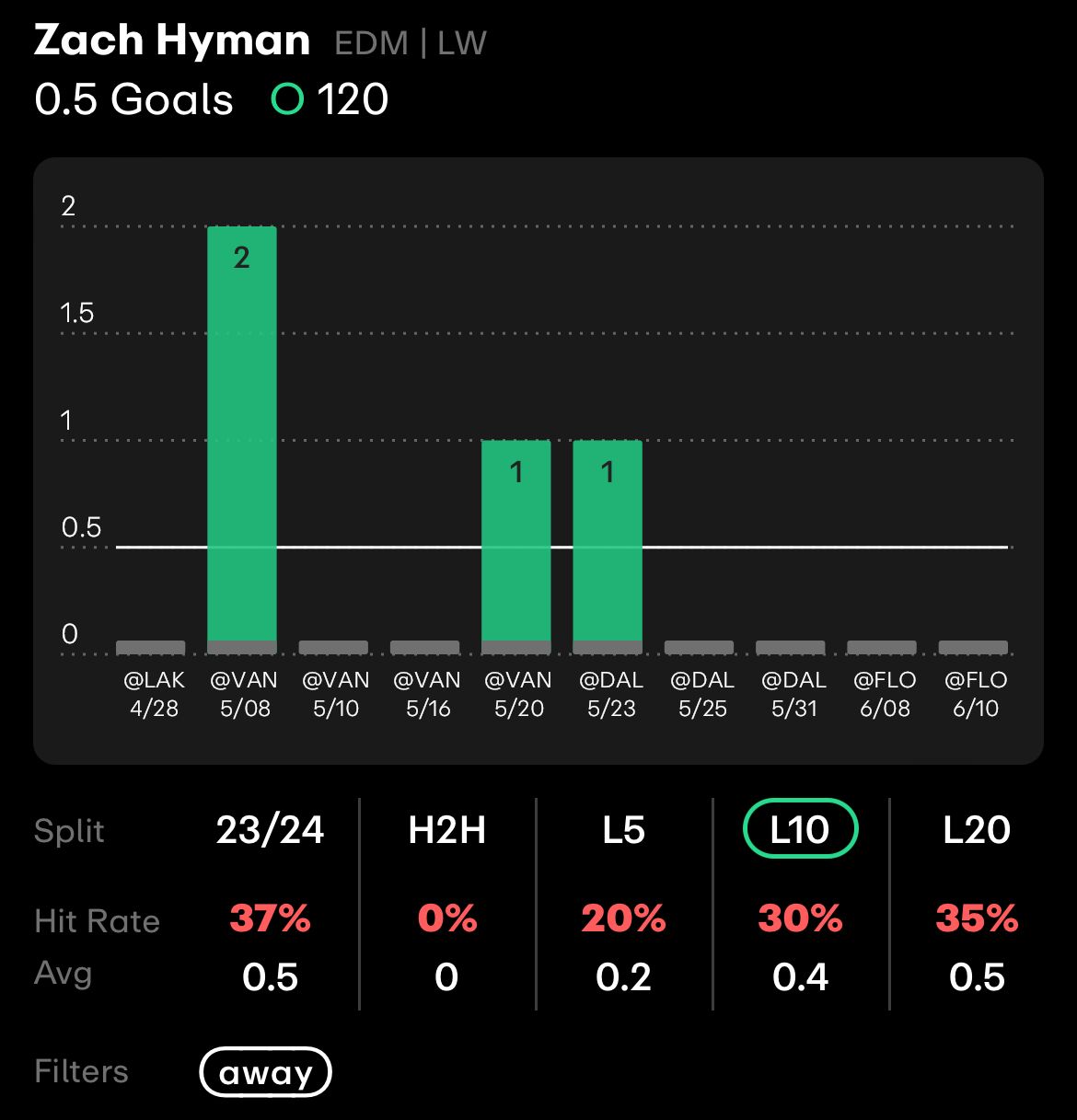 Like Connor McDavid, Zach Hyman has been much more effective on home ice in the playoffs than on the road. He has goals in 7 of his last 10 home games and just 3 of his last 10 road games.