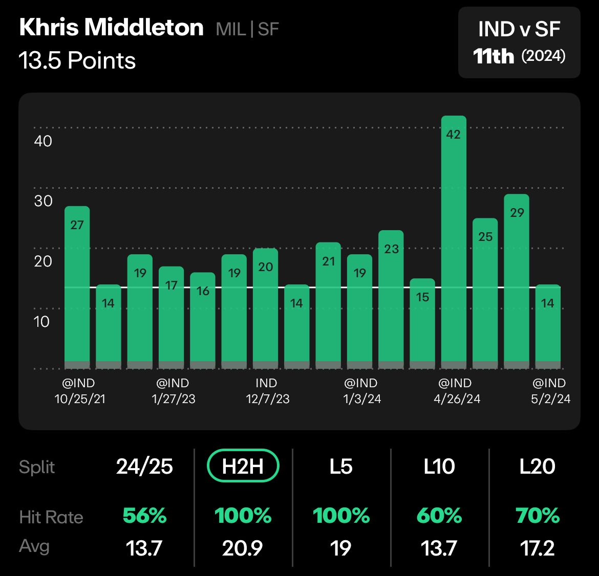 His points line in 13.5 today, and Middleton is coming off three straight games with 21 points. His head-to-head data against Indiana, with this points line, is literally perfect.