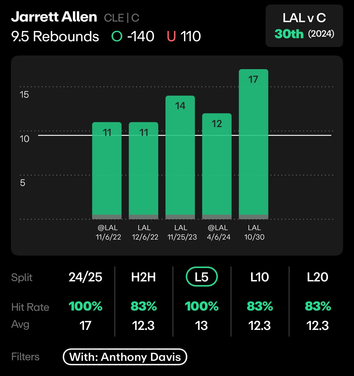 Cleveland at Los Angeles (9 PM): Jarrett Allen vs Anthony Davis