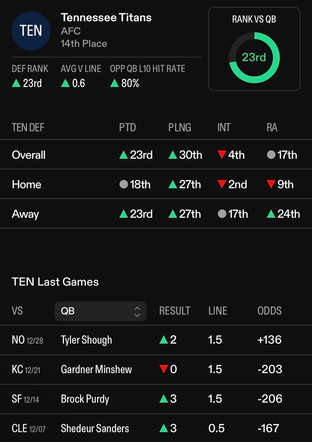 Quarterback matchup data against Tennessee