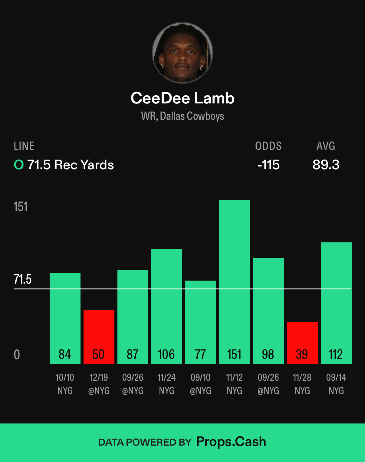 DAL @ NYG: CeeDee Lamb, 71.5 Receiving Yards