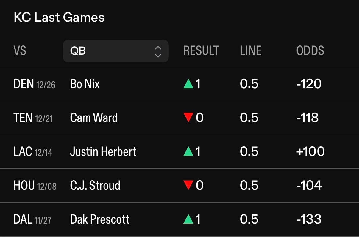 This game might be the worst of the season - both teams are playing for nothing, Mahomes is out for the year, Kelce is checked out for his career, and Bowers is chillin’ on injury reserve. This game SCREAMS ugly. In his only game this season starting, he threw an interception. Plus, the Chiefs’ defense has 3 interceptions in their last 5 games.