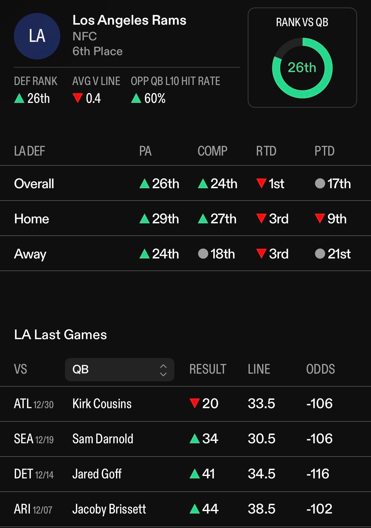 Because the Rams are so good and score so many points, opposing QBs have had to sling it against them, with 60% of opposing QBs clearing their passing attempt line against the Cardinals in their last 10 games.