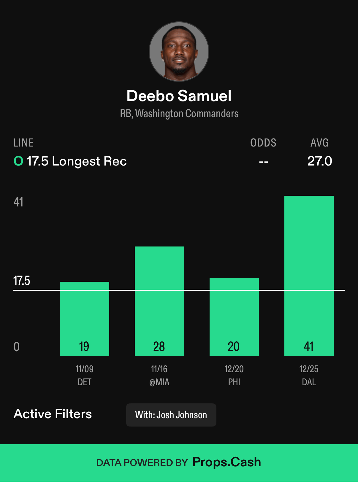Deebo is 4/4 against this longest reception line with Johnson under center, averaging a longest reception of 27.0 yards. And then there’s the matchup with the Eagles, who rank 30th in longest receptions against opposing wide receivers. Just recently, on December 20th, Deebo had the longest reception of 20 yards against Philly.