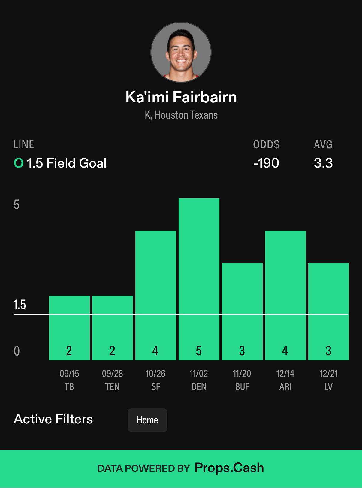 Six straight kickers have knocked in at least 2 field goals against the Colts, with 2 of the last 3 knocking in 3+ field goals against Indy. And then here’s Fairbairn, who has 2+ field goals in all but one game this season, and 2+ field goals in 11 straight games. Adding onto that, he has 3+ field goals in 6 of those 11 games. And he’s never gone under this line at home.