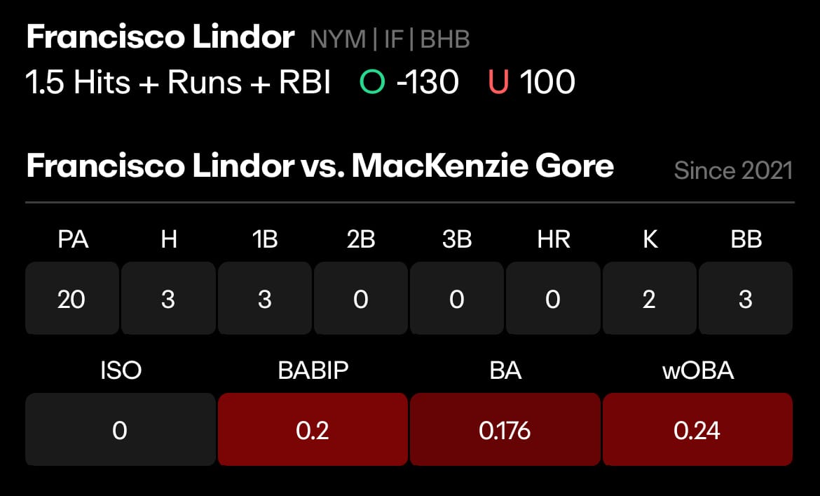 In those 7 games, Lindor is hitting .517 with a ridiculous 1.528 OPS. You won’t find him on the BvP Sheet below, but that’s just because he’s in for a decent challenge today. In 20 plate appearances against Nationals starter Mackenzie Gore, Lindor has mustered a measly .176 average with 3 singles.