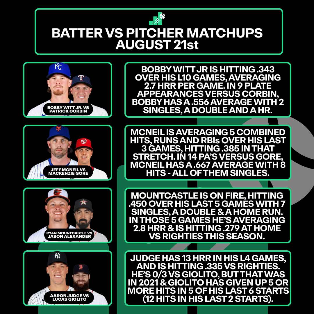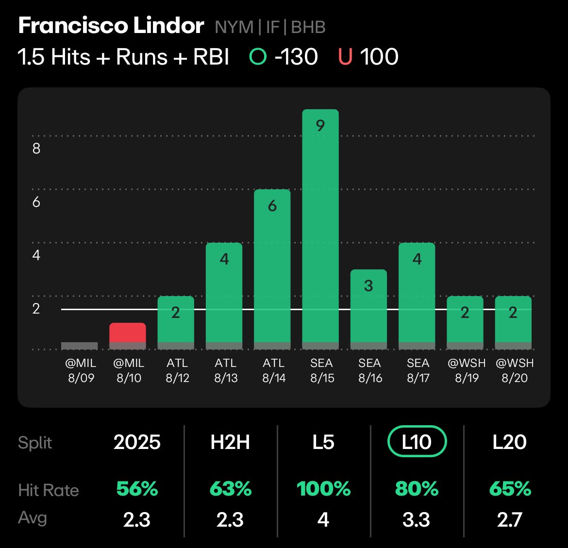 The Mets struggled big time in early August. From August 3rd to 15th, they lost 10 of 11 games, and were outscored 74-56. Since then, they’ve won 3 out of 4, and have outscored opponents 22-10. A big part of their mini bounceback has been the play of Lindor, who has 2 or more HRR in 5 of his last 7 games, and 7 HRR over his last 4 games.