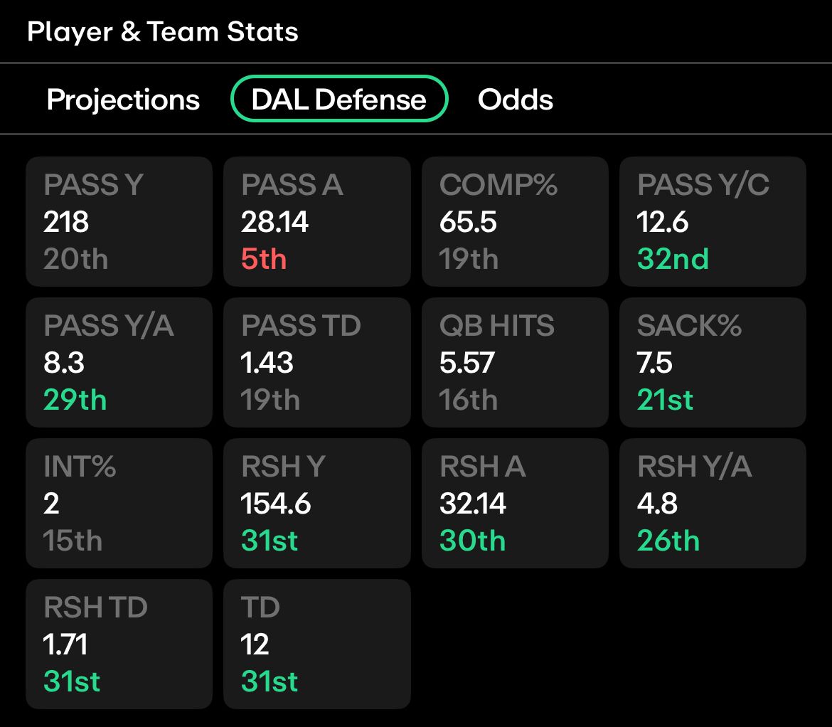 Dallas is right behind Carolina, 31st in both rushing yards allowed and rushing TDs allowed per game. Teams are averaging 32.14 rushing attempts per game against them, which is the 3rd most in the NFL.