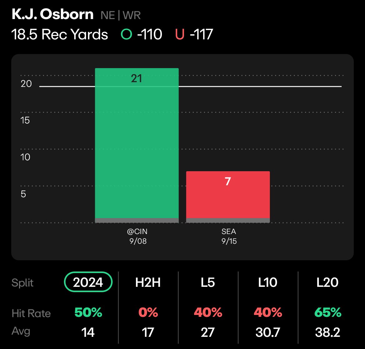 KJ Osborn meets Sauce Gardner. Gardner is the best corner in the NFL, and Osborn will line up on the outside against him tonight. If you’re looking at a receiving for the Patriots, Hunter Henry and DeMario Douglas should line up on the inside and avoid sauce, but Osborn won’t have that luxury. Not to mention Osborn has just 4 catches in 8 targets this season, racking up a meager 28 yards over two games.
