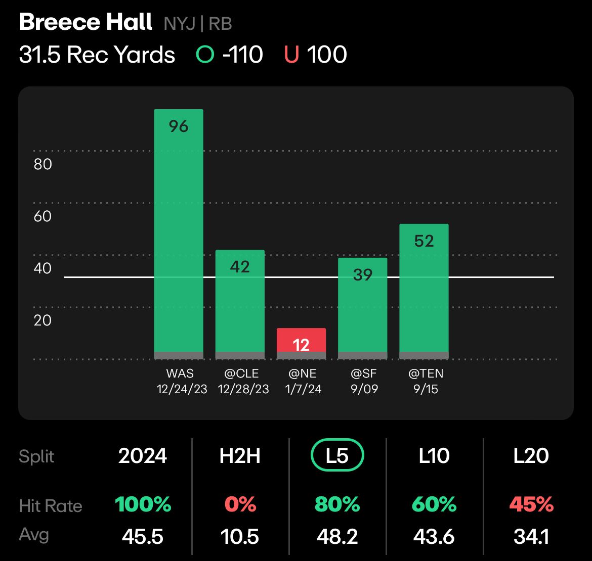 The offense has run through Hall through the first two weeks of the season, and all indications are that it should again tonight. Hall is 2 for 2 against this line this season, and he’s been over this line in 4 of his last 5 games dating back to last season.