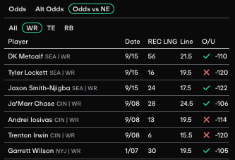 And look at the end of that list; Garrett Wilson had a 30-yard reception at the end of last season against the Patriots, and that wasn’t with Aaron Rodgers under center. Wilson has hit this line in one of two games this season, with a 26-yard reception in week 2.