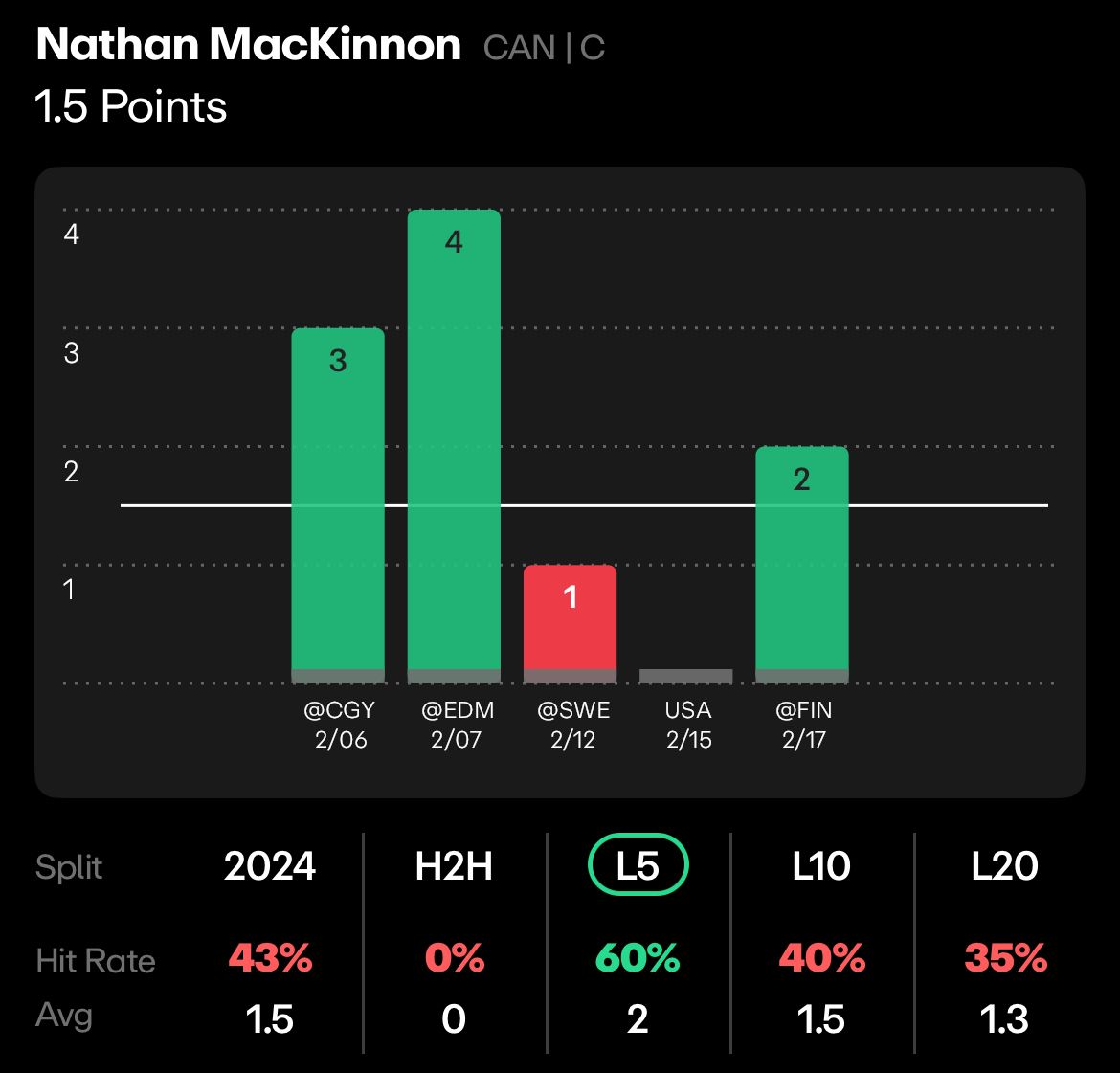 Nathan MacKinnon has 10 shots on goal in three games, 3 points in three games, and scored 2 goals in a must-win game against Finland. He had just one shot on goal against the US and didn’t register a point, but gets a second chance to come through on Thursday.