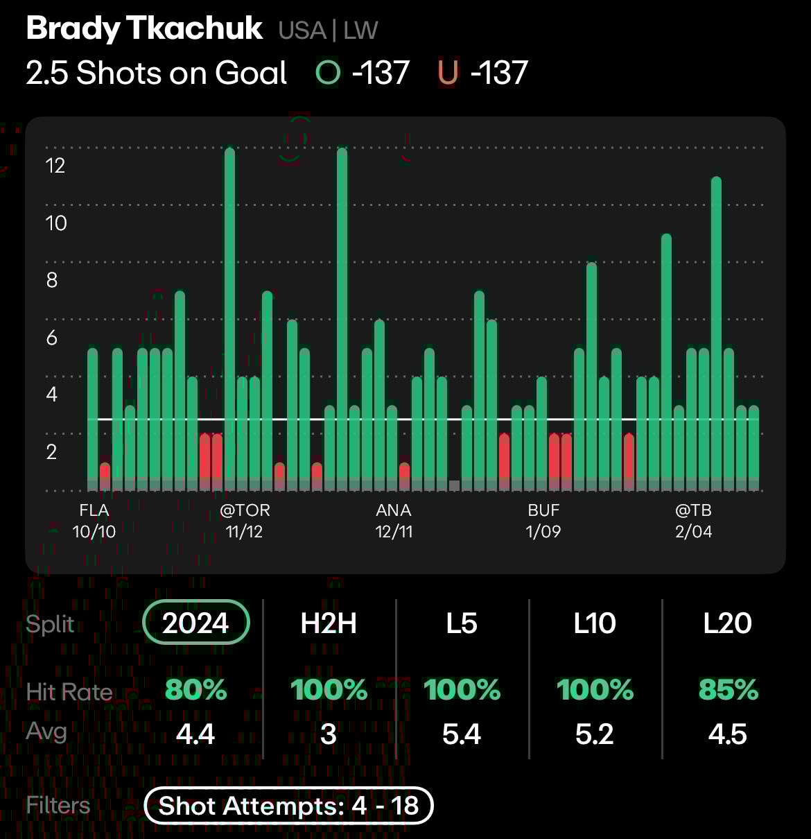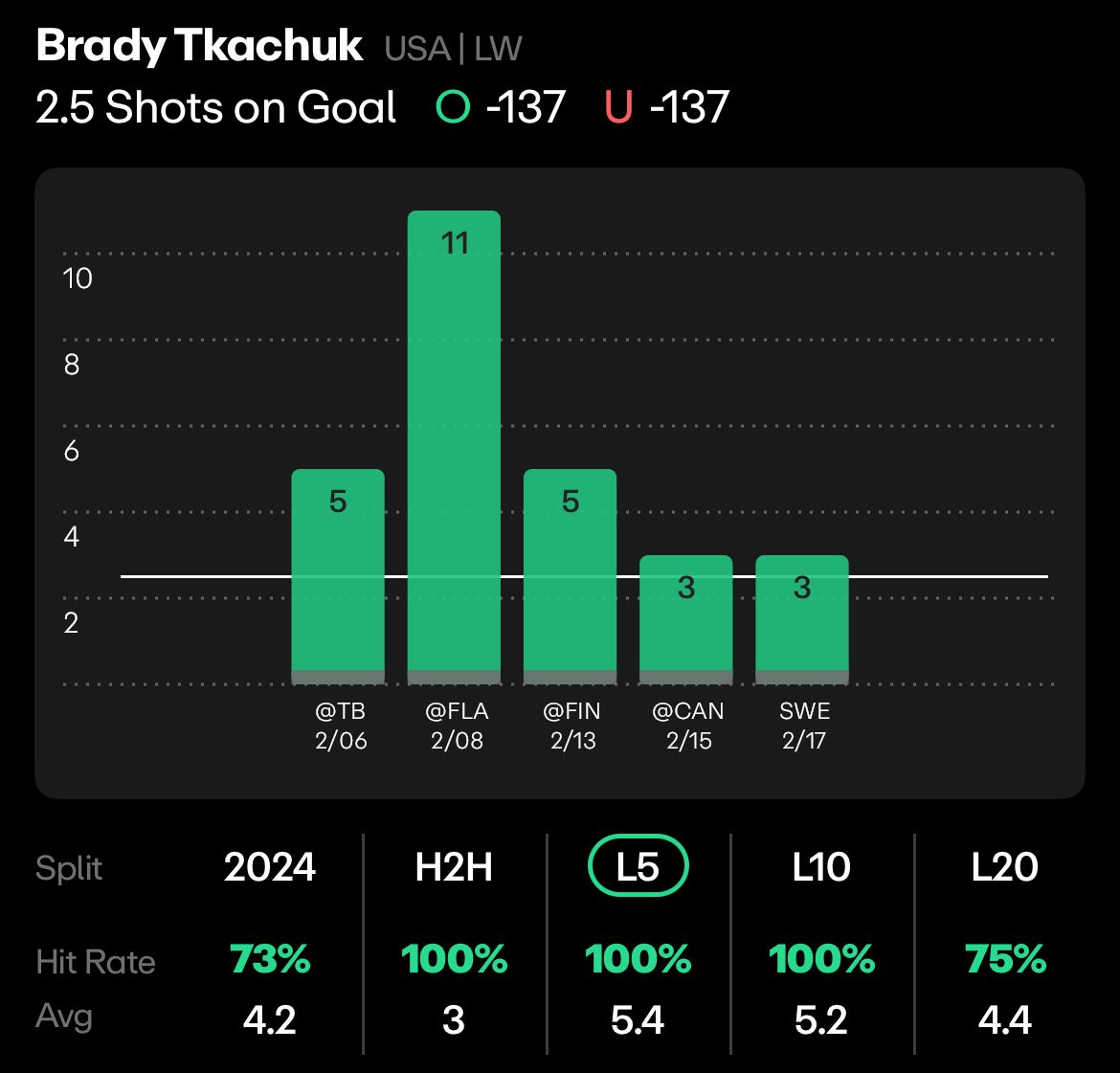Brady Tkachuk has played 2 and 1/8 games in this tournament thus far and has gone over his shots on goal prop in all three games. Yes, he only played 1/8 of their third game against Sweden, leaving after racking up two minutes of ice time. But in those two minutes of ice time, he still managed three shots on goal.